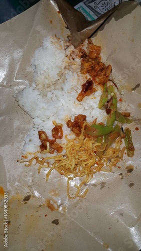 Nasi Bungkus, simple people's food. Packaged rice is white rice and side dishes for one person wrapped in a paper-backed banana leaf, so that it can be carried and eaten elsewhere.