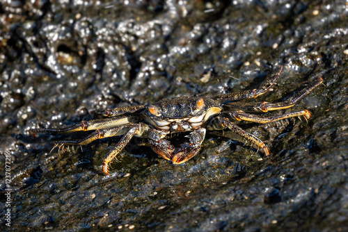 Natal Lightfoot Crab - Grapsus tenuicrustatus, common beautiful crab from Indo-Pacific shores and beaches, Mauritius island.