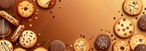 National cookie day banner with cookies and text National Chocolate Chip Cookie Day on a brown background, web page template for an e-commerce store or online shop