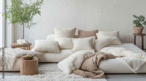 National Decorating Month Cozy minimalist living room interior with fluffy textures and natural light