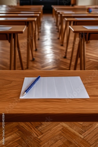 National Educational Support Professionals Day Empty exam classroom with desks and paper in focus