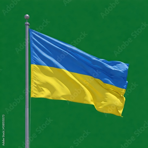 national flag of ukraine nation waving on the wind, banner on greenscreen green solid color background, flagpole on green screen with simbol of the country waves on windy day