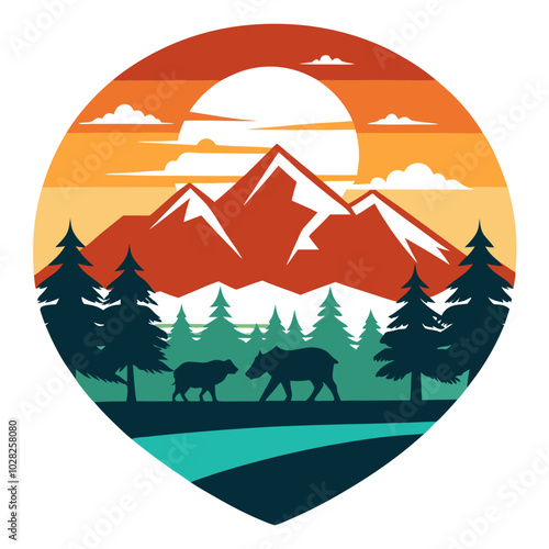 National Park Landscape Silhouette with Wildlife on Retro Vintage Vector t-shirt design
