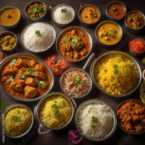 National Rice Pudding Day. Assortment of indian dishes - rice and curry