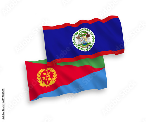 National vector fabric wave flags of Eritrea and Belize isolated on white background. 1 to 2 proportion.