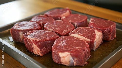 National Wagyu Day Premium cuts of fresh raw beef steak on metal tray for culinary preparation