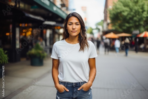Native American woman in her late 30s, dressed casually in a t-shirt and jeans, walking through a bustling urban park