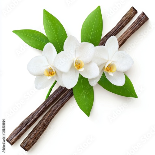 Natural arrangement of dried vanilla sticks surrounded by beautiful white orchid flowers on a neutral background