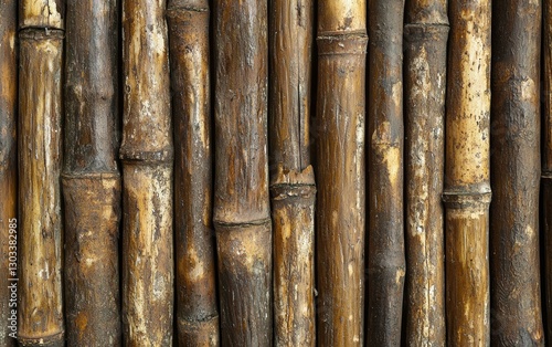 Natural bamboo wall featuring varied textures and colors created by age and weathering