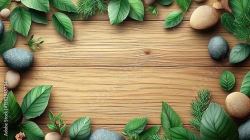 Natural, calming design with leaves, stones, and wood.
