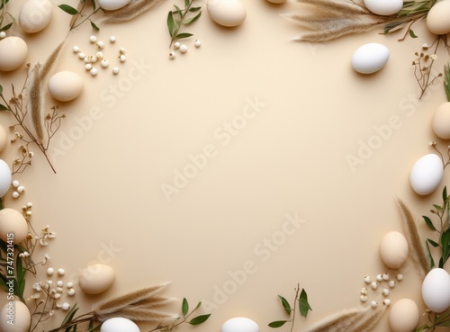 Natural flat lay border with white and beige eggs, leaves, and twigs on a cream background, great for Easter