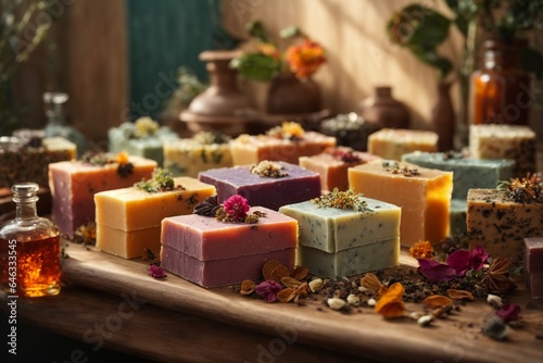 Natural handmade soap bars with aromatic herbs and dried flowers on wooden background