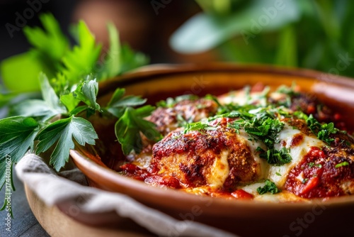Natural light close-up photography of a tempting chicken parmesan in a clay dish over green plant leaves background