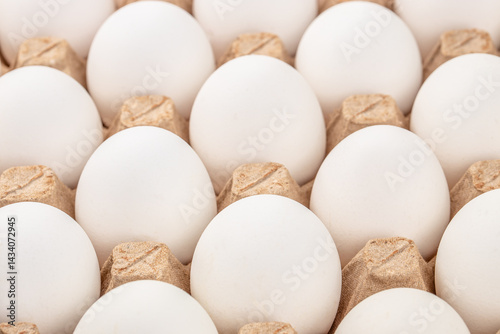 Natural organic chicken eggs in egg paper box. Close-up view. Hen farm eggshells collected arranged packaged for sale.