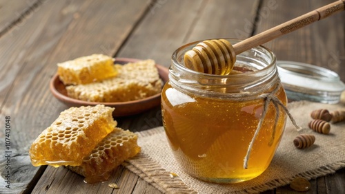 Natural organic honey in glass jar with honey dipper and honeycombs on wooden background, honey, organic, natural
