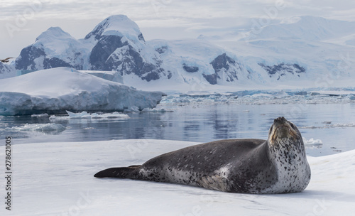 Natural predators of Antarctica region is leopard seal. Relax animal lying on the ice.