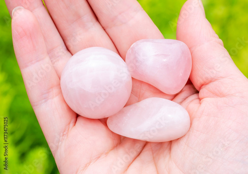 Natural rose quartz minerals in hand. Semi-precious multi-colored stones, minerals close-up. Mineralogy. Collection of minerals.
