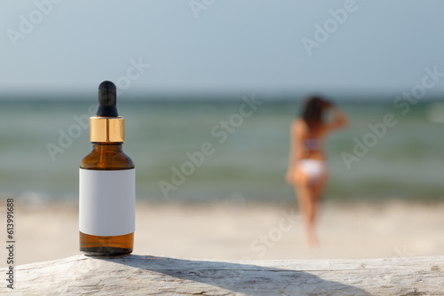 Natural sun defense concept. Dropper bottle on the beach. Blurred silhouette of a woman, the concept of skin protection.