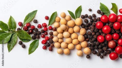 Natural, unground peppercorns laid out on blank white background, ideal for recipe visuals