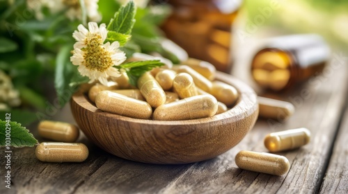 Natural Wellness: Herbal Supplements in a Wooden Bowl