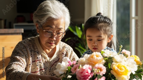 Natural Wellness, Mindfulness, and Longevity in Harmony. A heartwarming scene of a grandmother and granddaughter arranging flowers together, highlighting the bond between generations.