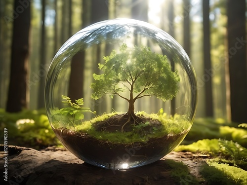 Nature, a tree growing in a glass sphere on a sunny day in the forest outside. Eco idea, saving the globe