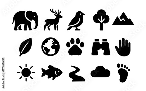 Nature and wildlife icons: silhouette collection of animals, plants, and outdoor elements