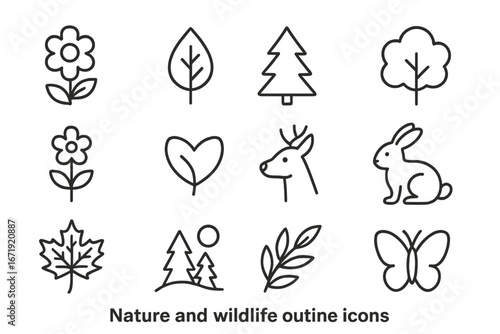 Nature and Wildlife Outline Icon Set, Floral Leaf Forest Elements in Line Style, Vector Cartoon Illustration with Transparent Background, Ordered Set 4