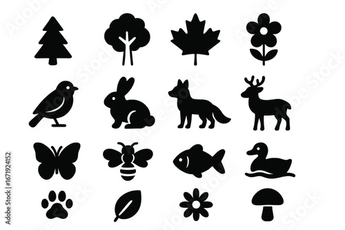 Nature and wildlife silhouette icon set featuring diverse flora and fauna in black silhouettes, vector cartoon illustrations with transparent background, ordered collection of animals and plants