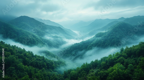 Nature background featuring a misty mountain range illuminated by soft morning light