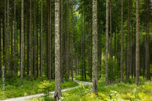 nature background with dense forest with foot path. lush green forest background. minimalist forest landscape. empty background with lush green