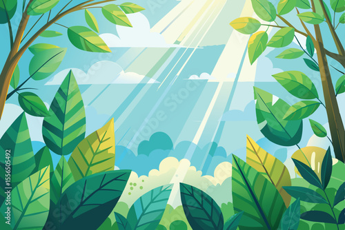 Nature background with green leaves and sun rays. Vector illustration in flat style