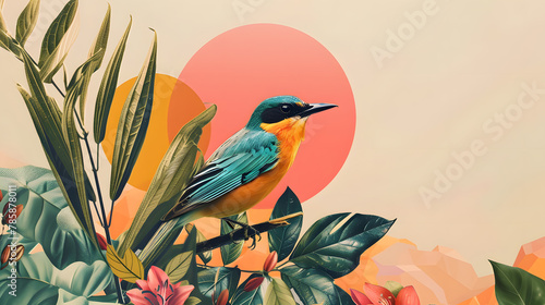 Nature collages have elements of geometric shapes, leaves, flowers, birds.