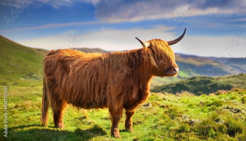 nature farm Highland cow, grass field background, Fresh and Relax concept. For montage product display or design key visual layout. View of copy space, alpine farm, rural life, mountain farming, farm