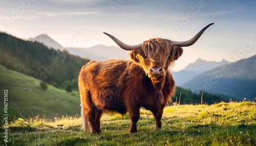 nature farm Highland cow, grass field background, Fresh and Relax concept. For montage product display or design key visual layout. View of copy space, alpine farm, rural life, mountain farming, farm