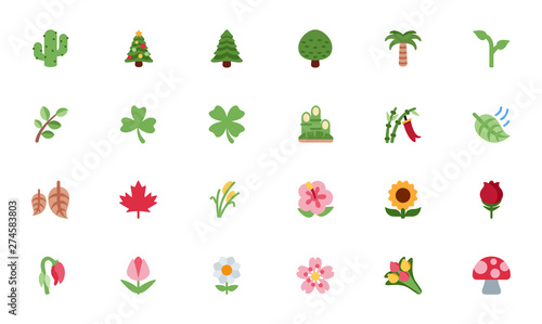Nature, Floral icons, trees, flowers, leaves vector illustration flat style cartoon symbols, emojis, emoticons set, collection.