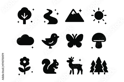 Nature Icons Grid. Tree ecosystem. Solid icons set of tree, river, mountain, sun, cloud, bird, butterfly, mushroom, flower, squirrel, deer, forest grove.