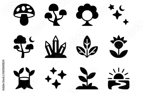 Nature icons mushroom tree crystal flower sprout stars moon vector
