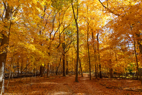 Nature in autumn. Fall weather outdoor. Leaves in autumn nature forest. Fallen leaves. Windy path. Autumn nature forest. Orange and yellow fall leaves. Fall season colors