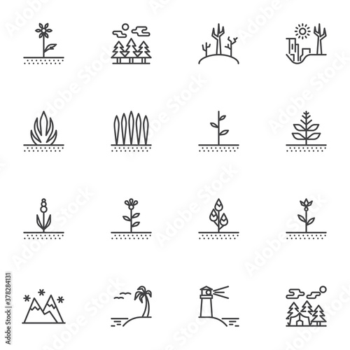 Nature, outdoors line icons set, outline vector symbol collection, linear style pictogram pack. Signs, logo illustration. Set includes icons as forest trees, flowers, plants, mountains, island