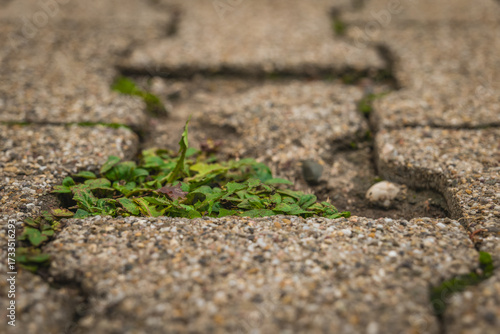 Nature reclaiming urban space with green plants growing through cracked pavement