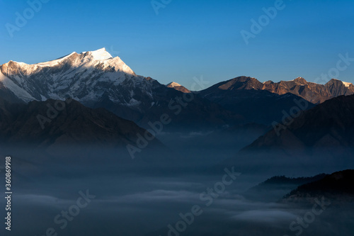 Nature view of Himalayan mountain range at Poon hill view point,Nepal. Poon hill is the famous view point in Gorepani village to see beautiful sunrise over Annapurna mountain range in Nepal.
