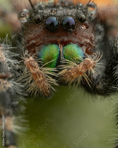 Nature wildlife macro image of Phidippus regius jumping spider action on green leaf. Shows eye details.