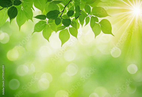 Nature-inspired abstract background with soft sunlight and green hues. Ideal for advertising designs with space for text. Blur effect creates a tranquil environment with bokeh sun rays.