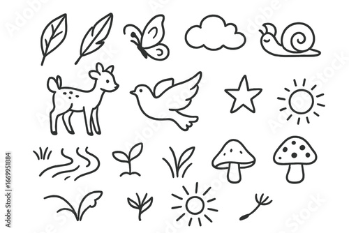 Nature's Gentle Doodles. Hand-drawn doodle illustration grace beauty flower, butterfly, feather, ribbon, heart, star, moon, sun,