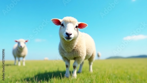 Nature’s Harmony: White Sheep Roaming a Vibrant Green Landscape
