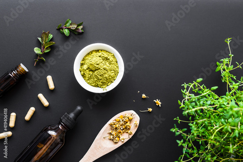 Natürliche Kräuter in Tabletten und Pulverform. auf einem schwarzen Hintergrund. Flat lay, Thymian, Löffel.