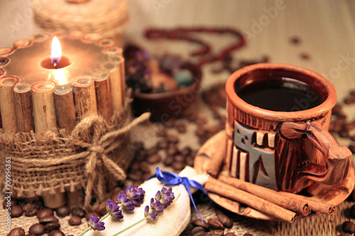 Naturmort With Cup of Coffee, Coffee Beans And Candle