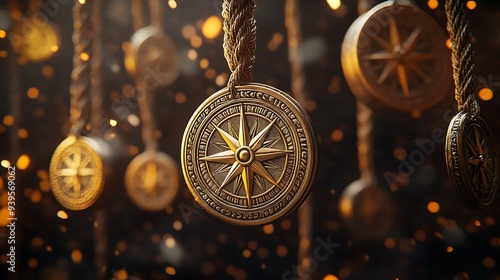 Nautical Charm: Vintage Brass Medals with Compass Designs Amidst Glowing Confetti - 3D Render Illustration
