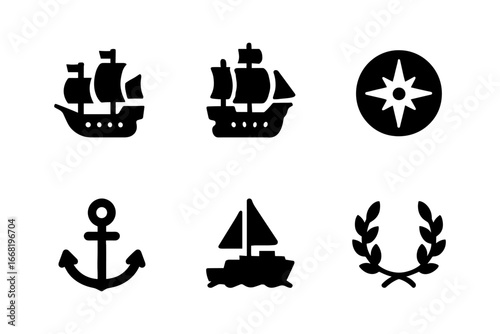 Nautical icon set: ships, compass, anchor, sailboat, and laurel in bold silhouette style